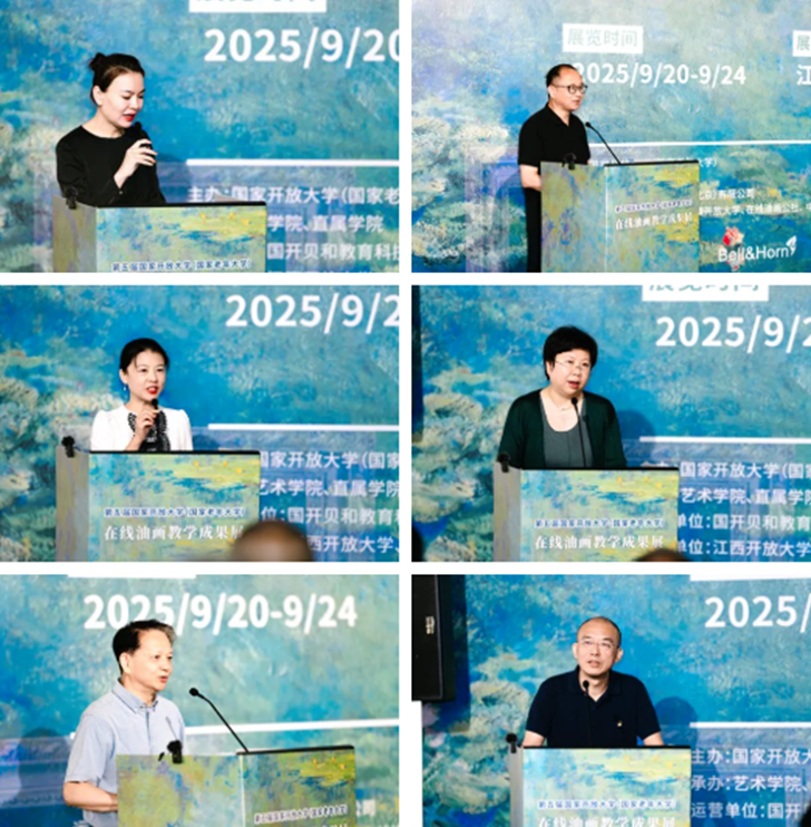 The exhibition was organised by the OUC School of Art and College Affiliated to SUC. Attendees included LIU Zili, Secretary of the Party Committee of Jingdezhen Ceramic Culture Tourism Group; CHEN Xingyan, former Secretary of the Party Committee of Fujian Open University; LIU Caimei, Dean of the College Affiliated to SUC; XU Hang, Deputy Director of the Art Operation Centre of the School of Art; and TANG Yingshan, Professor of the Online Oil Painting Teaching Team. The event was hosted by LIU Xiaonan, Deputy General Manager of OUC Bell & Horn Education and Technology Beijing Co., Ltd.
