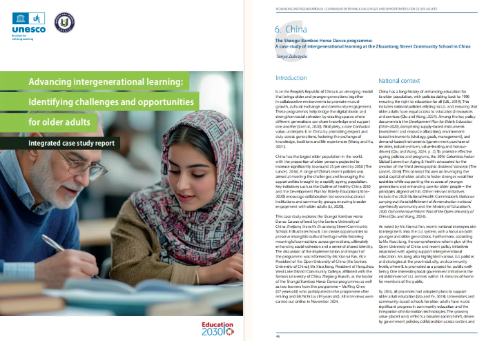 The Shangsi Bamboo Horse Dance Programme: A case study of intergenerational learning at the Zhuantang Street Community School in China, recommended and offered by Seniors University of China (SUC), has been selected in the integrated case study report Advancing Intergenerational Learning (IL*): Identifying Challenges and Opportunities for Older Adults, published by the UNESCO Institute for Lifelong Learning (UIL) and now publicly available on the UNESCO website. This programme is the only case study from Asia featured in the report.